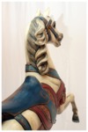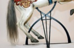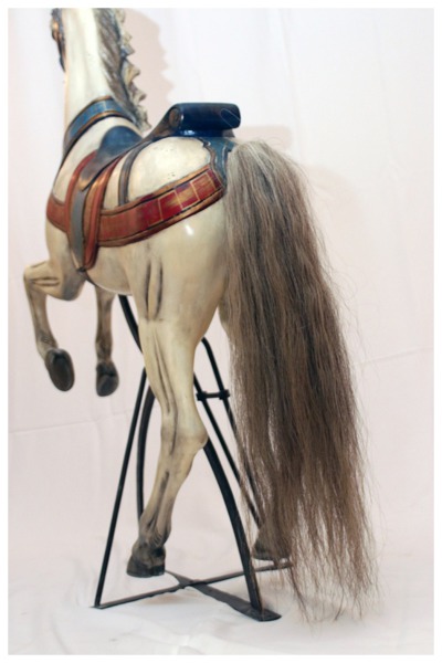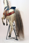 Hier also das kleinere Karusell-Pferd: es ist von der Abmessung etwas kleiner und kürzer als das große. Es steht es im Gegensatz zum großen auf einem Gestell, so dass es mit allen Beinen über dem Boden schwebt. Der Körper ist schlanker und kleiner als das große. Vom Volumen (und Gewicht) ist es fast die Hälte des größeren.